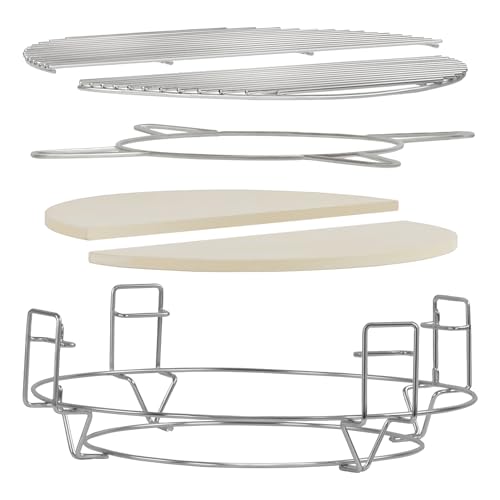 Inhoud levering: deze hoogwaardige barbecue-accessoireset bestaat uit een robuust roestvrijstalen frame met een diameter van 46 cm, twee halve maan pizzastenen, een roestvrijstalen houder voor de tweedelige steen of voor wok en grillpan en twee halve maan grillroosters van roestvrij staal. Je ontvangt een royaal, meertraps grilloppervlak dat het je mogelijk maakt om verschillende gerechten tegelijkertijd te bereiden en je grillkunsten naar een nieuw niveau te tillen